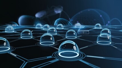 A futuristic digital network visual with glowing hexagonal nodes and transparent bubbles, symbolizing connectivity and technology.