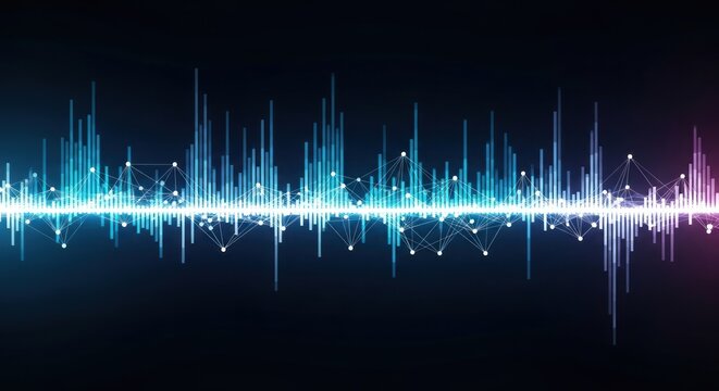 Futuristic digital network with interconnected nodes and waveforms