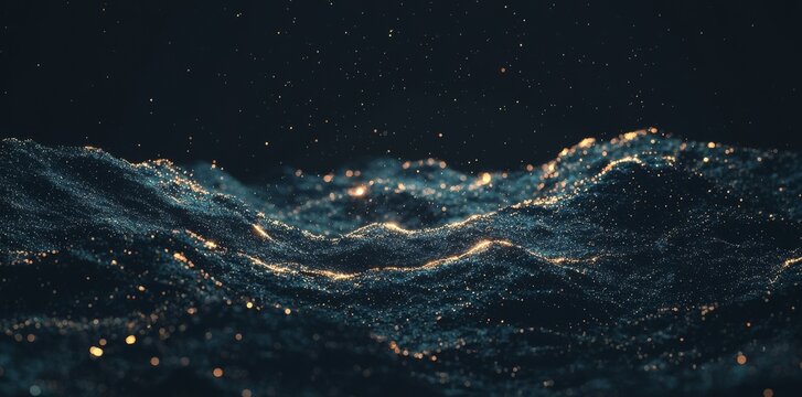 An abstract, glowing digital wave form with interconnected nodes and scattered particles, set against a dark, futuristic background with soft blue and orange li