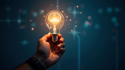 AI, Machine learning, Hand holding light bulb with virtual Artificial Intelligence and virtual digital brain. AI Technology.Science and artificial intelligence technology, innovation for futuristic
