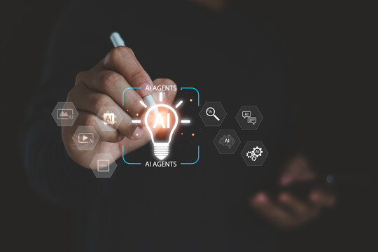 Innovative AI agents concept with glowing light bulb icon and digital technology interface, representing artificial intelligence solutions, automation and futuristic business innovation. AI tech.
