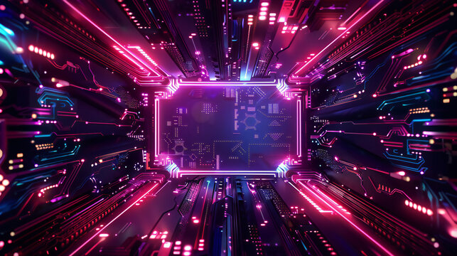 Glowing rectangular frame with neon blue and pink lights on a dark background with circuit details