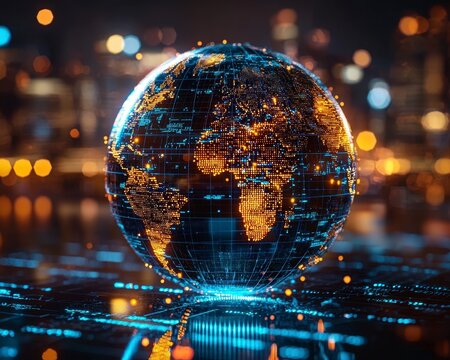 A glowing digital Earth,  network connections,  global communication, futuristic technology.