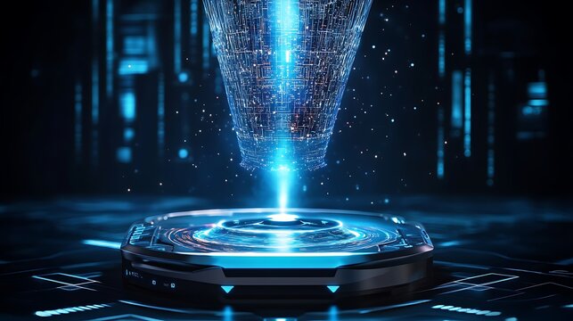 Futuristic circular interface with glowing blue light and radiating energy beams.