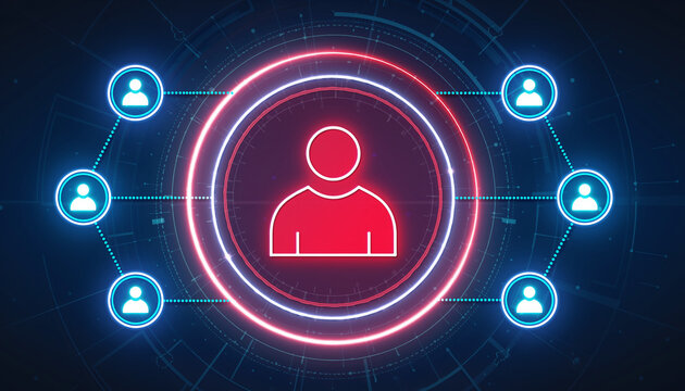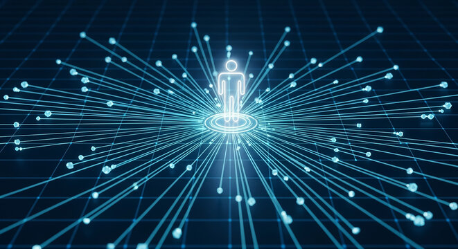Digital Connectivity: A striking digital illustration showcases interconnected nodes radiating from a central human figure, illustrating network, with an enigmatic deep blue backdrop.