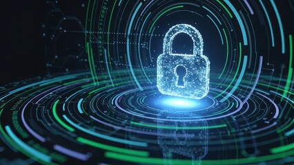 Futuristic digital padlock hologram symbolizing cybersecurity