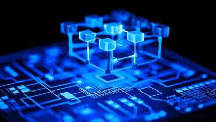 AI integration system with futuristic glowing circuit brain icon floating on hand, representing artificial intelligence, data processing, automation, and technology-driven digital business solutions