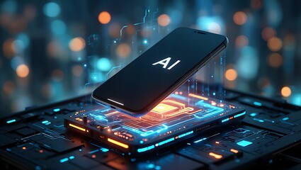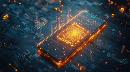 Futuristic smartphone glowing over digital circuit board. Innovative tech concept.