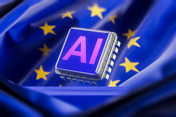 Futuristic AI microchip glowing in pink and blue over EU flag, symbolizing European artificial intelligence technology and regulation concept. 3D Rendering