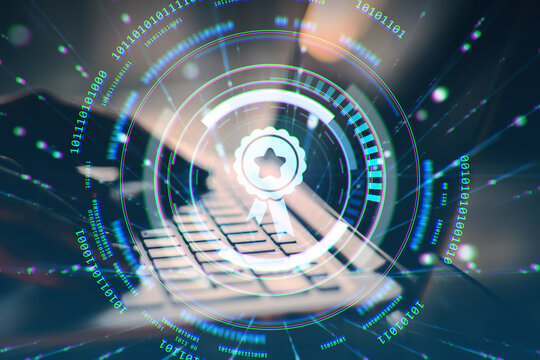 Digital certification icon over keyboard with futuristic interface and binary code on dark background representing technology and business concept.