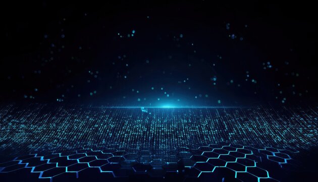 abstract digital futuristic landscape with glowing blue binary code on a hexagonal grid surface