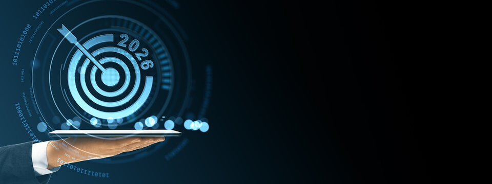 Businessman hand holding tablet with digital target bullseye and arrow labeled 2026 on abstract futuristic background with glowing light effects.