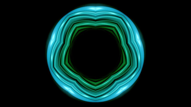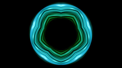 Glowing neon pulsating floral shape with dark hole in the middle on a black background. Animation. Colorful neon dance of circular shape.