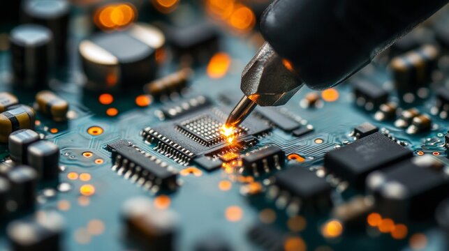 Close-up view of a soldering iron working on a microchip circuit board, electronics, precision engineering, innovation, and modern technology development in the world of hardware and computing devices