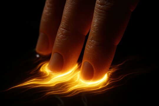 Close-up of fingers pressing down on glowing orange light trails, symbolizing futuristic biometric access through heat-sensitive technology