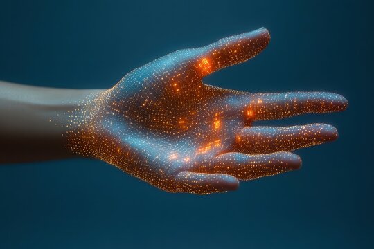 Biometric hand silhouette featuring vibrant scanner patterns against a dark background