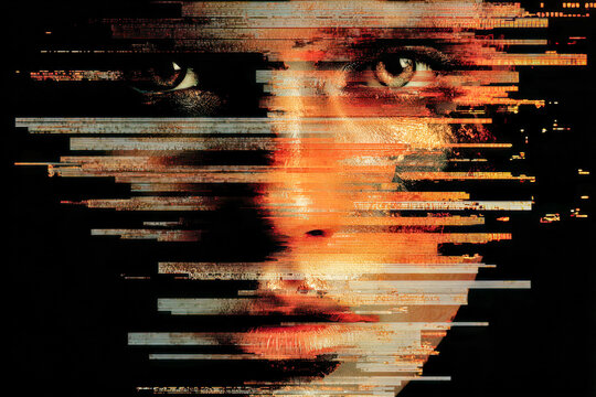 Abstract digital illustration of a fragmented human face with glitch effects and horizontal pixel distortion against a dark background for futuristic design concepts