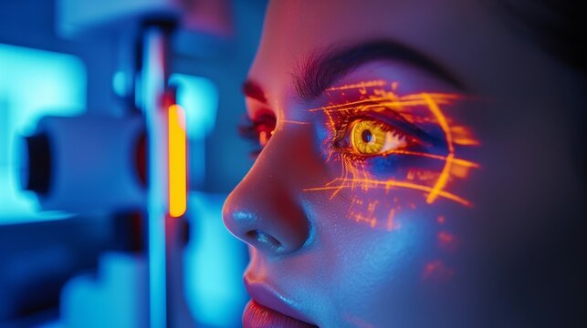 Close-up of a neon-lit eye in a futuristic scanning setup, blending cyber elements with vibrant orange and blue hues.