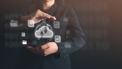 data storage and document cloud system with world icons on a digital virtual screen interface on background