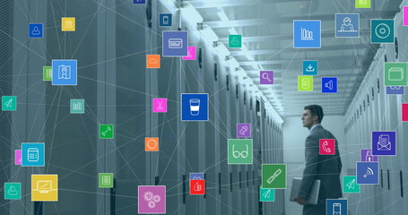 Image of network of connections with icons over caucasian man in server room