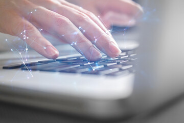 Close-up businesswoman hand working on laptop keyboard. Innovation and technology, data recoed system, document management concept. Double exposure