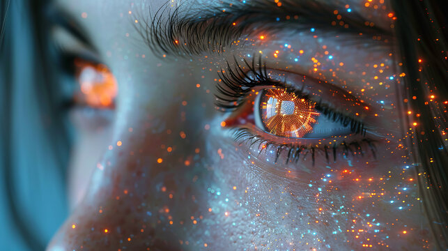 Cybernetic Eye Human face with one eye replaced by a futuristic cybernetic prosthesis, dramatic lighting.