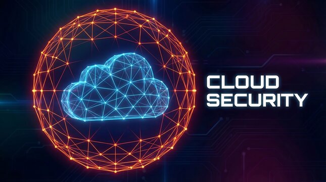 Cloud security concept with glowing blue cloud inside orange network circle on dark background with text