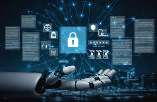 A futuristic robot hand interacts with numerous digital security icons and data streams, illustrating the advancement of technology and the importance of cyber protection. Gantry