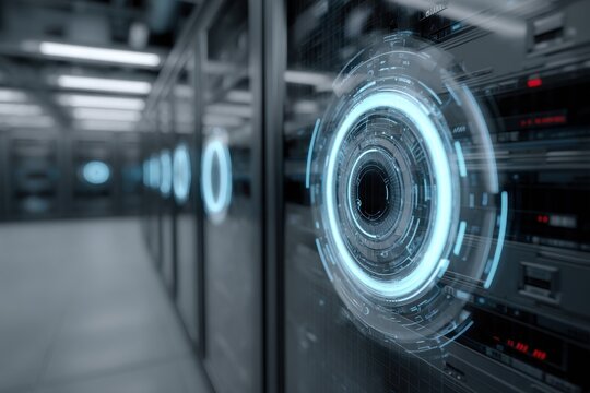 A futuristic server room with glowing circular interface elements, showcasing advanced technology and data processing infrastructure, creating a high-tech atmosphere.