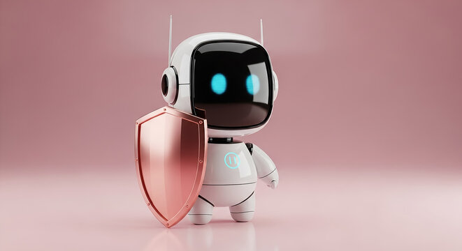 White robot holding pink shield protecting data on pink background