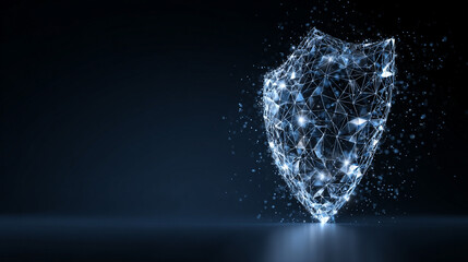 3D futuristic low poly guard shield symbol glowing on a dark blue background, representing cybersecurity, data protection, and modern digital wireframe design.