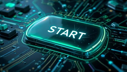 Human finger presses glowing blue button labeled 'start simulation' on futuristic digital interface with abstract technological elements sparkling lights in background, for innovation