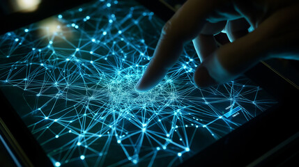 The person taps on the tablet screen, selecting a bright blue icon to initiate the neural network creation process, as a web of connected nodes begins to form, expanding in real-ti