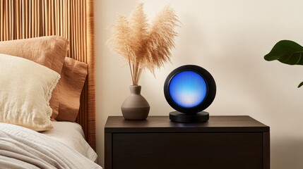 A sleek black alarm clock with a glowing blue LED screen stands on a dark walnut nightstand.