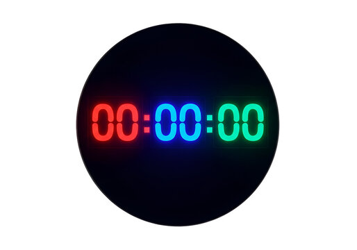 Circular digital timer display with vibrant red, blue, and teal neon numerals against a black backdrop.