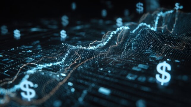 Digital financial interface featuring glowing icons and intricate designs during nighttime setting
