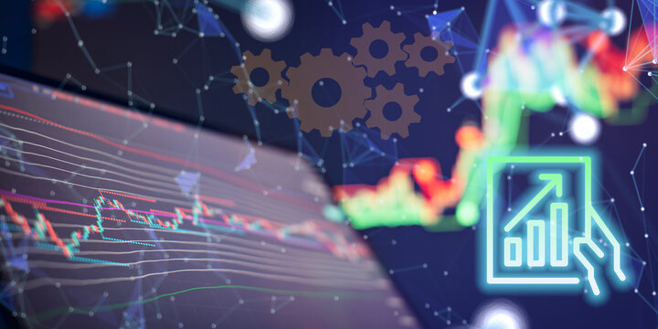 Technology-driven stock market analysis with trading chart, interconnected network graphics, and growth icons