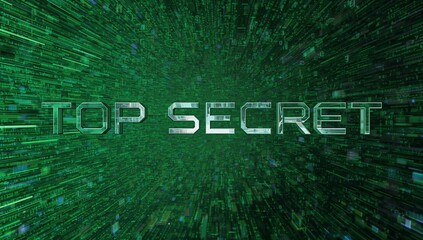 Displaying metallic TOP SECRET text sliding through digital data tunnel, with streaming binary code
