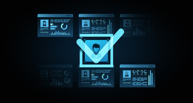 Digital verification concept with glowing profile icons and approval checkmark. 3D Rendering