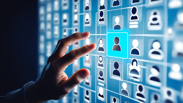 Human finger selects glowing person icon on futuristic blue user interface grid for digital recruitment or social networking