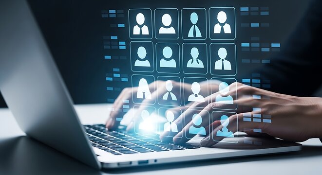 Hands typing on a laptop with a futuristic digital interface displaying a grid of user profile icons representing online recruitment human resources and digital networking concepts