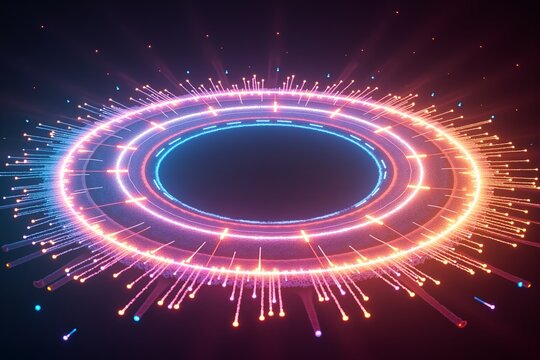 Neon rings pulse in cosmic void, radiant data streams explode outwardfuture tech meets digital cosmos.