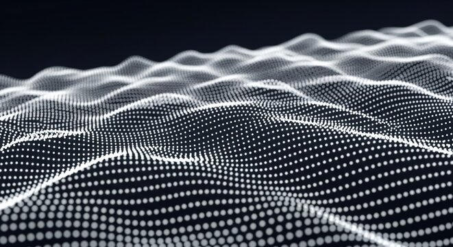 Monochrome undulating wave of glowing dots and mesh forming a mysterious futuristic digital landscape