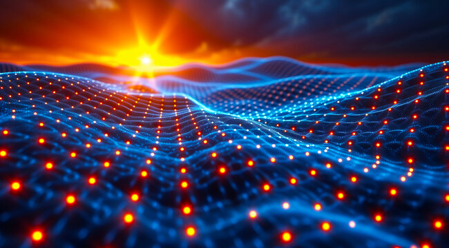 digital landscape with waves of blue mesh and glowing red dots, representing a network or data, with a vivid sunset in the background