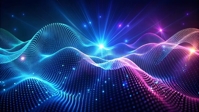Flowing neon wireframe wave with glowing particles and futuristic blue-purple gradient