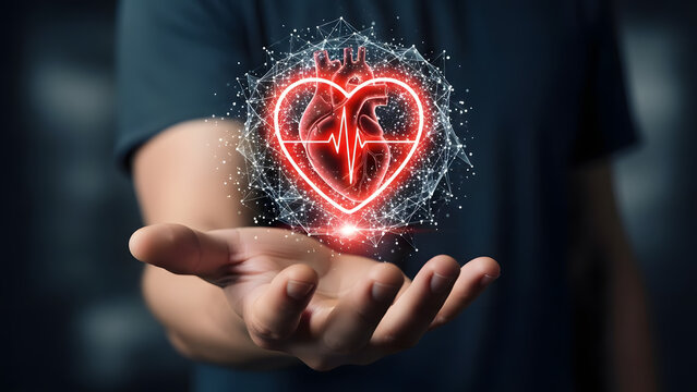 A person's hand holding a glowing red digital heart icon with an ECG waveform, symbolizing health, technology, and care.