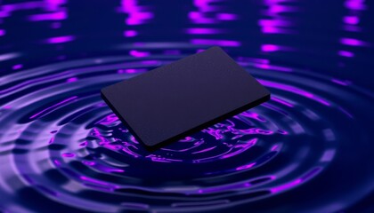 Purple ripple effect. Dark rectangular plate floating above circular neon waves creating futuristic digital art composition in purple and blue tones.