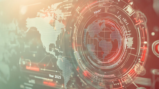 Futuristic digital interface with a world map and data visualization elements, highlighting technological advancements and global connectivity for the year 2025.