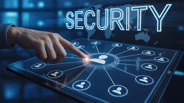Cybersecurity network protection and data privacy concept with hand touching interface on screen