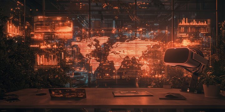 Futuristic holographic interface with world map analytics